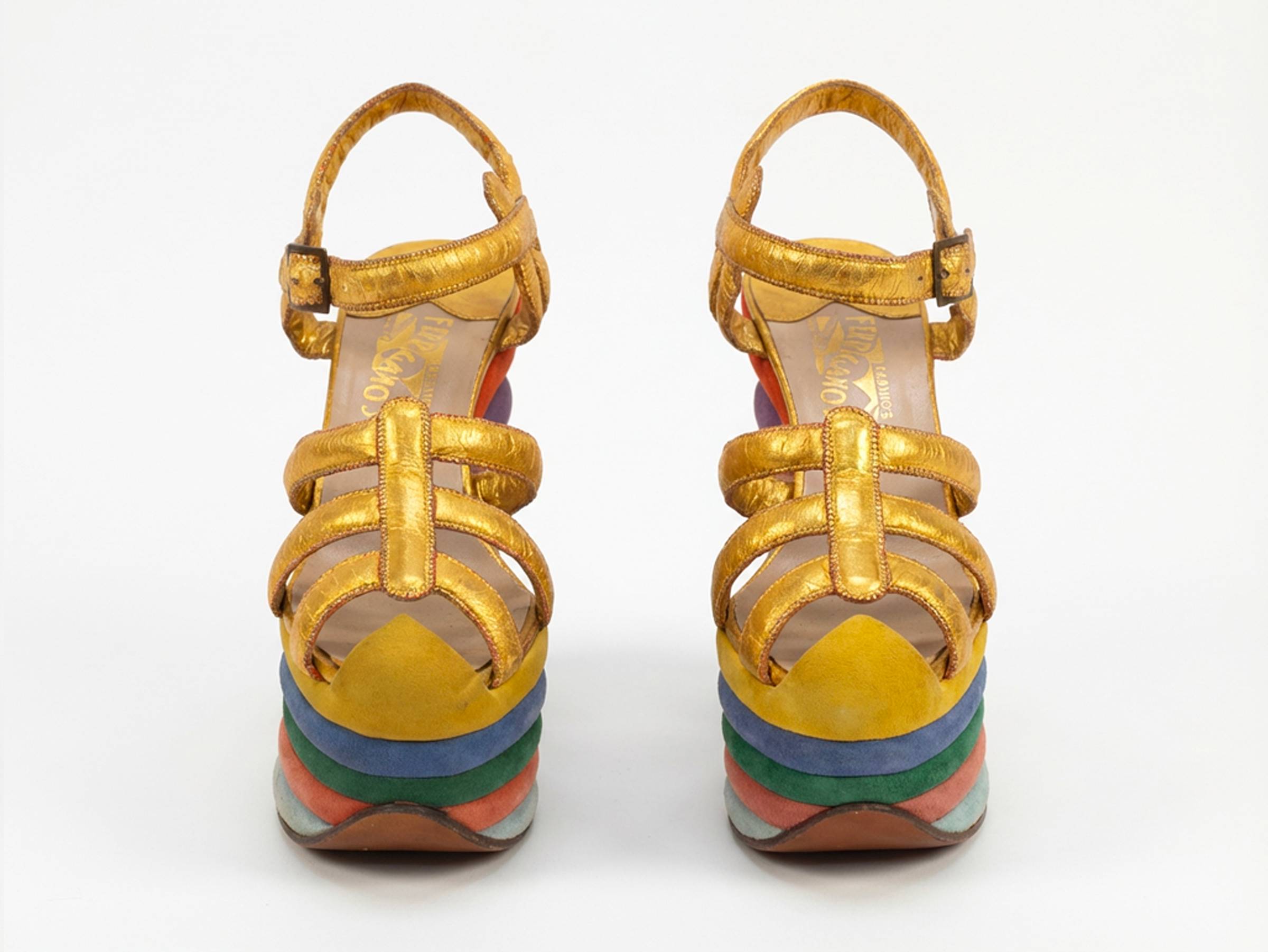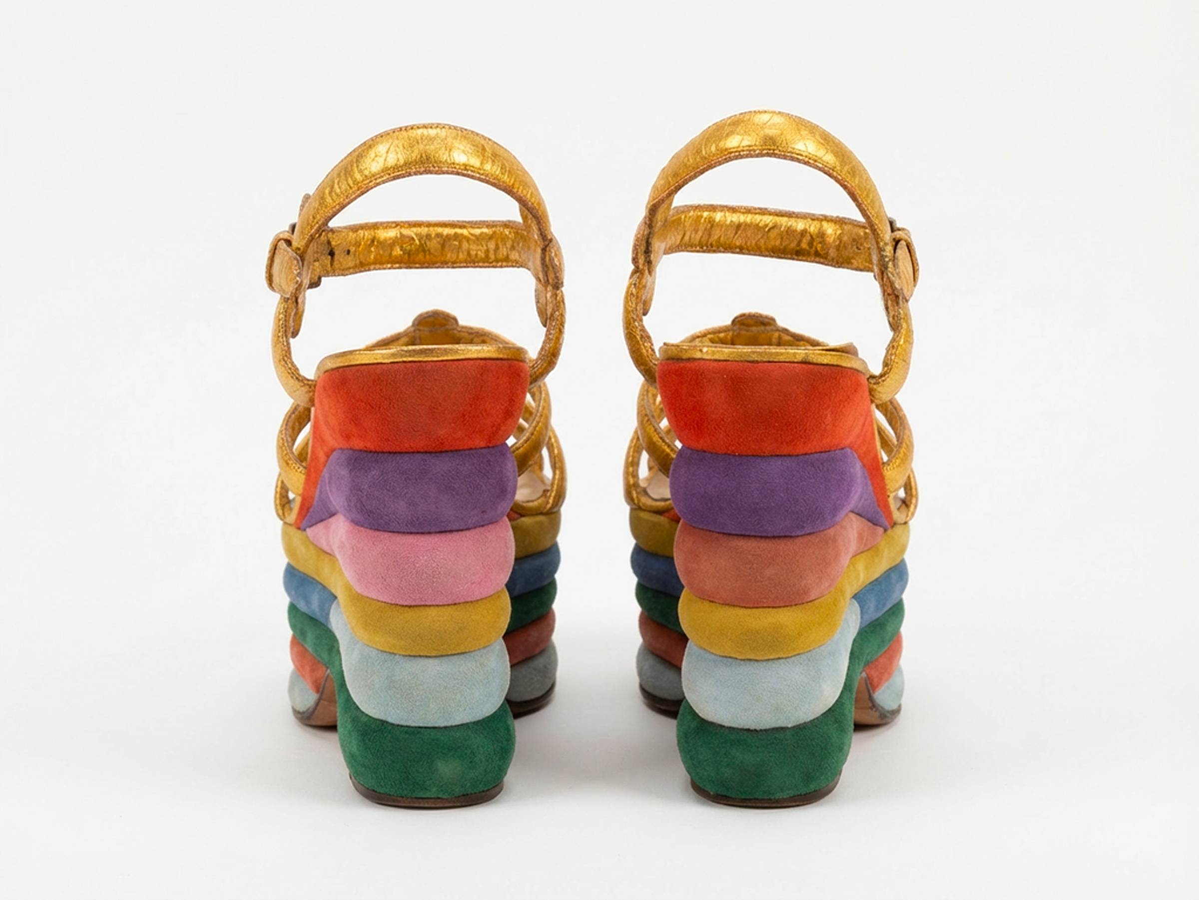 Into this wedge he poured color and personality. The sandal that emerged was far from the subdued, linear styles dominating the late 1930s. Covered in rainbow stripes of suede and gold kidskin straps, the shoe was vibrant, unapologetic, and almost surreal. Today it is known simply as the Ferragamo Rainbow, and a key reason the wedge has endured in fashion for decades.