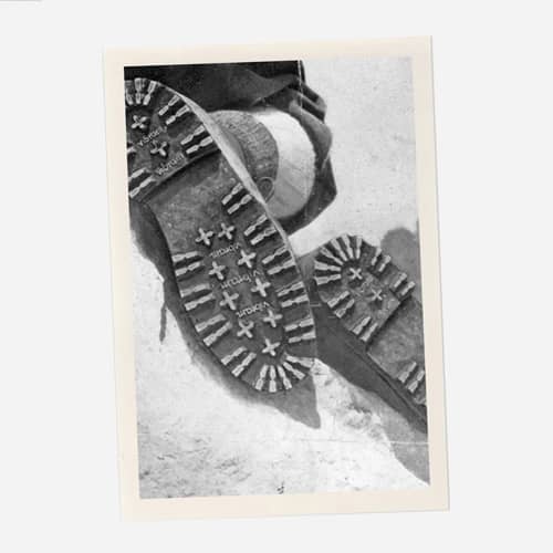 Metal crampons were added externally to protect the leather—much like modern alpine boots pairing soft uppers with aggressive, sacrificial outsoles. Even the lacing system was engineered, with small discs added to prevent laces coming undone at altitude, where dexterity vanishes and mistakes compound quickly.